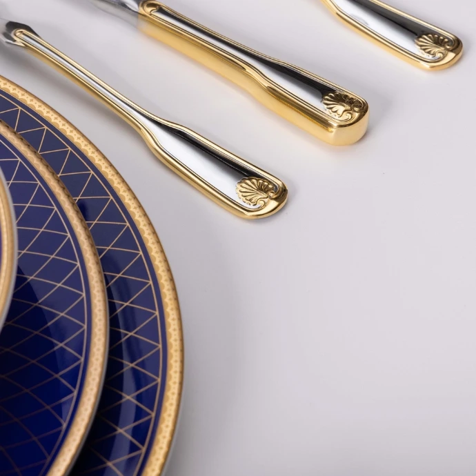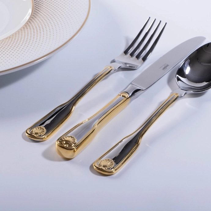 Seti Venus Decor Gold nga Zepter është një koleksion elegant dhe luksoz, që bashkon cilësinë e lartë me dizajnin modern dhe të sofistikuar. Produktet janë të bëra nga çeliku i klasit premium dhe kanë një përfundim të artë që u jep një pamje të shkëlqyer dhe të rafinuar. Seti ofron komoditet maksimal dhe është i dizajnuar për të shtuar stil dhe luks në çdo tryezë.
