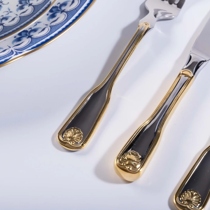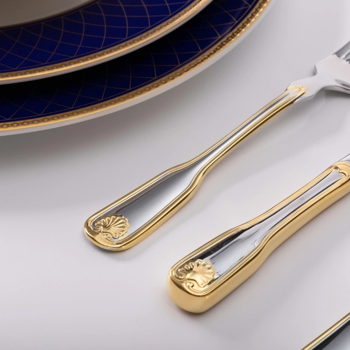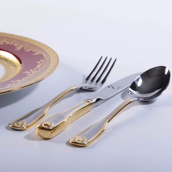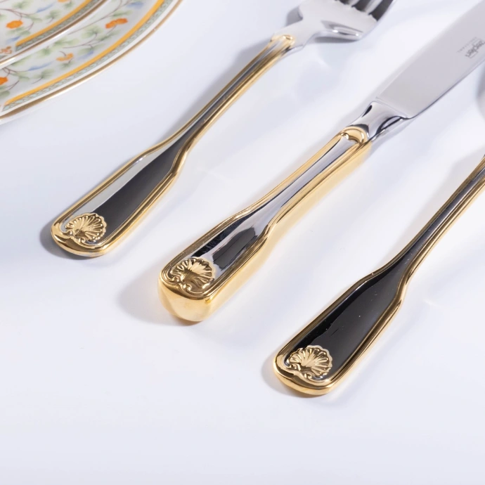 Modern dhe luksoz, ky set i lugëve është i përkryer për darka solemne dhe vjen i kompletuar me gjashtë thika, gjashtë pirunë, gjashtë lugë, gjashtë lugë çaji dhe gjashtë lugë kafeje, dhe i gjithë seti është i bërë nga çelik inox i cilësisë së lartë. Dizajni tërheqës dhe i atraktivan dhe veshja e pazakontë me ar e bën këtë set një shtesë të shkëlqyer për çdo koleksion lugësh.